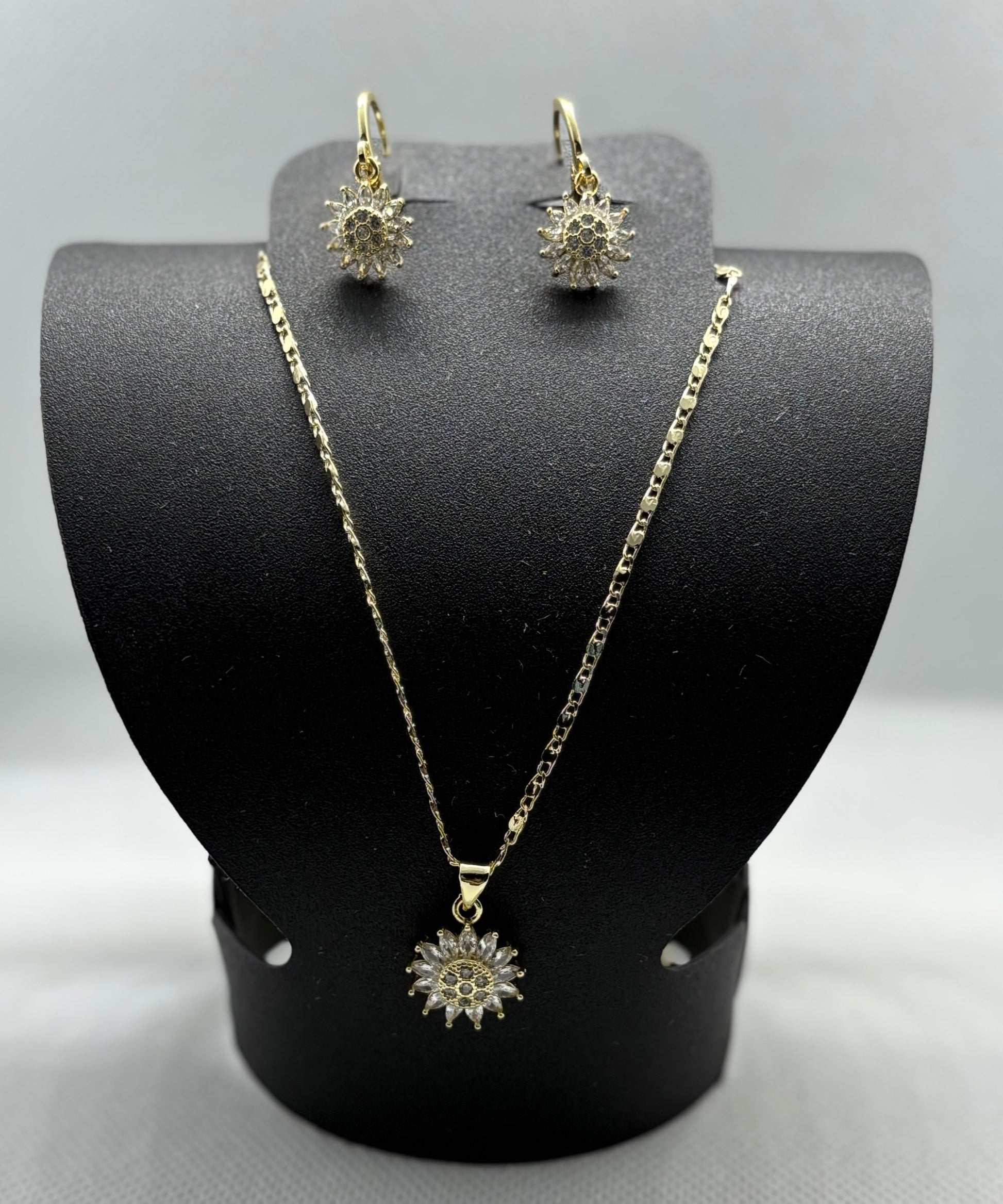 Juego de aretes y Dije girasol con cadena chapa de oro
